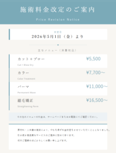 これまで、お客様への負担を最小限に抑えるべく努力を重ねてまいりましたが、今後も質の高い薬剤の使用や、より満足度の高い技術・サービスを安定して提供し続けるため、苦渋の決断ではございますが、2026年5月1日より価格の改定をさせていただくこととなりました。